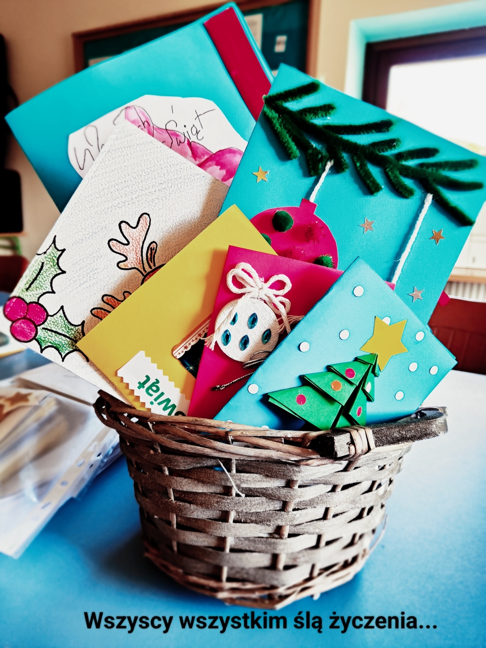 Kartka dla mieszkańców Domu Pomocy Społecznej w Kasinie Wielkiej nasi uczniowie wspólnie ze swoimi rodzicami wykonali kartki Bożonarodzeniowe z życzeniami dla mieszkańców DPSu.