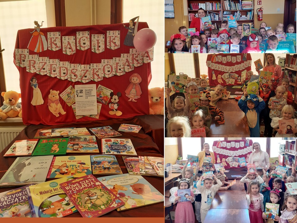 W ramach NARODOWEGO PROGRAMU ROZWOJU CZYTELNICTWA zakupiono dla dzieci dużo nowych książeczek. Część z nich umieszczono w bibliotece w KĄCIKU PRZEDSZKOLAKA, skąd dzieci mogą je pożyczać. Przedszkolaczki w tym dniu, wraz z wychowawczyniami odwiedziły bibliotekę szkolną wypożyczając swoje pierwsze książeczki w których również „spotkały bajkowych bohaterów”.
